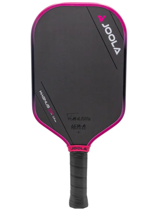The JOOLA Tyson McGuffin Magnus 3S serves up maximum paddle power, spin and pop in an elongated shape with a compact 5 inch handle length. JOOLA's full Carbon Frame construction fortifies the Magnus 3S with power, good vibration control and overall paddle durability. Adding to the versatility of the Magnus 3S is the option to tone down or increase core power with either a 16 mm or 14 mm Propulsion core respectively. Surrounding the core's edge is JOOLA's HyperFoam Edge Wall technology, which allows the core to amplify the power of your shots and also complements comfort along with paddle stability. And to keep the power and game plan inside the lines with excellent spin potential plus a crisp, predictable response is JOOLA's Charged Carbon surface. Weight wise, the Magnus 3S averages 7.9 ounces / 8 ounces, which strikes a nice balance of paddle agility and stability. All of the 3S offerings come standard with an embedded NFC chip making it easy to authenticate your paddle with a tap of a smart phone. Well suited for intermediate to advanced player levels, the overarching theme of the JOOLA Magnus 3S is its "cake and eat it too" type of performance. Meaning faster swings produce huge power and when it comes time to construct points with softer commands, the Tyson McGuffin Magnus 3S is just as attentive and reliable. UPA-A certified.