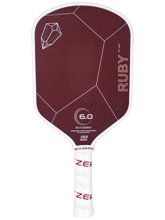 The Six Zero Ruby is a testament to the never ending pursuit of Six Zero to craft the highest performing pickleball paddles the world has ever seen. Spending over 10 months in development the Six Zero Ruby has unlocked a new evolution in paddle design and performance. Utilizing a 100% Aramid Fiber sourced from DuPont™ Kevlar® as its face material and an eye catching red cloth matched with a white trim, the look of this paddle only adds to its superior performance on court. The Ruby combines unique attributes of high strength, durability and thermal stability. This gives you more consistent shots time and time again while carbon faced paddles tend to wear over time. Additionally, the paddle features a unibody construction, an aerodynamically flared design for optimal reach and a 3D Carbon Forged Elongated handle for added comfort for two-handed backhand players. Carbon Fusion Edge technology which injects foam and utilizes a light-weight carbon seam to fuse the top and bottom faces provides a crisp feel and forgiving sweetspot. All in all, the Ruby outshines the competition with its exceptional construction and technologies.